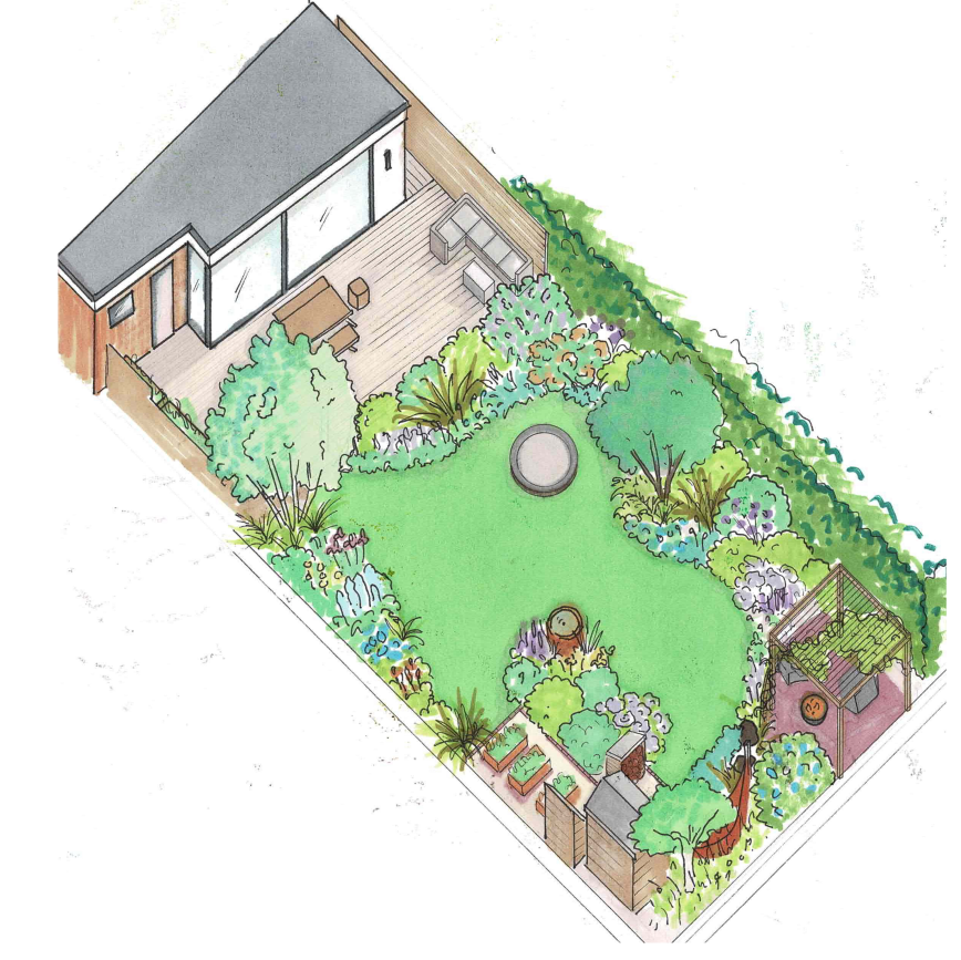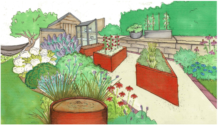 Curved sweeping boarders around lawn – packed full of flowering shrubs and colourful perennials, as well as multi stem trees. Planting to connect with landscape view beyond. Mini allotment tucked away at bottom of garden, self binding gravel and corten steel planters. Corten steel water feature nestled into the planted borders. Block paved circle seating space with bespoke timber pergola to enjoy the view onto the moors.