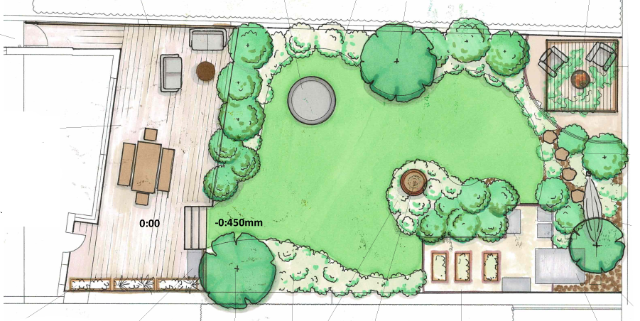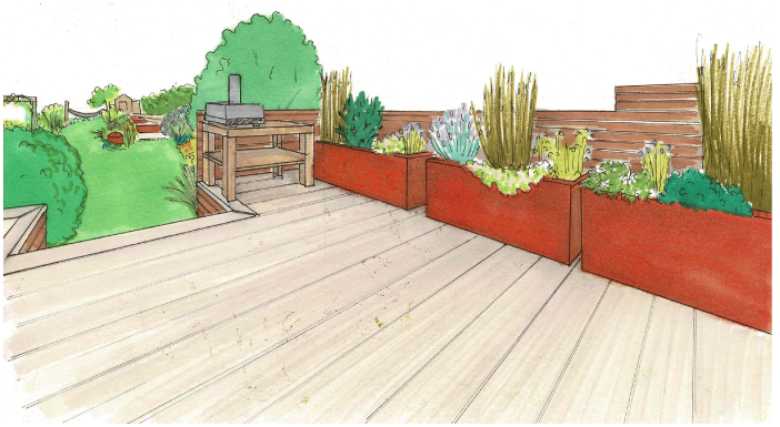 Design back garden: Raised millboard deck connecting their open plan interior living space with outdoor. Space for outdoor kitchenette. Corten steel planters to provide screening from neighbours.