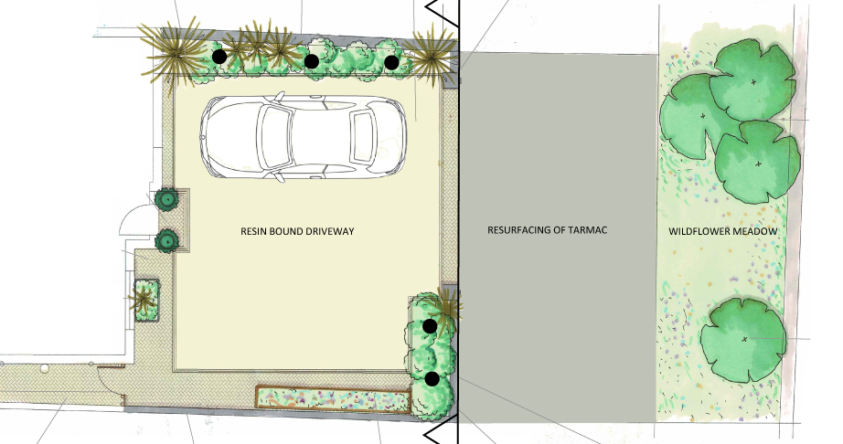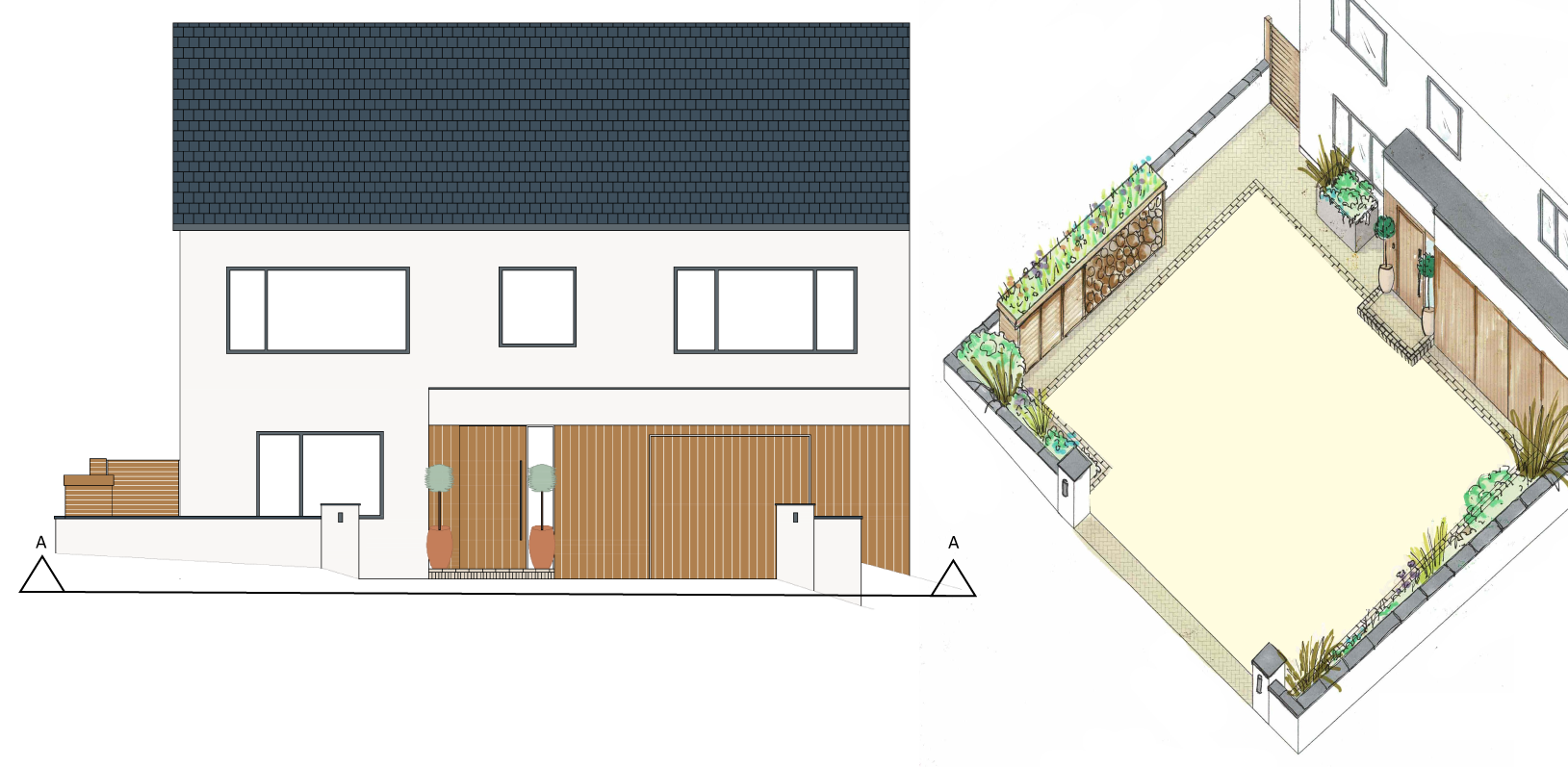 Design front: Resin bound main driveway surface. Widening of driveway entrance. Block paving details around the borders. Bespoke log and bin store with green roof. Materials chosen to compliment the modern architecture of the house and connect with the rear garden design.