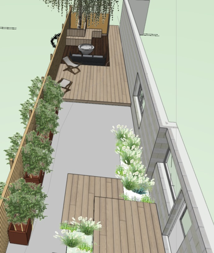 Brief: Clients wanted to create a useable space with interest. Existing site was an old tired softwood deck. Long narrow space, needed to be broken up to make it feel less like a corridor. Silver birch tree to remain and make a feature of it.