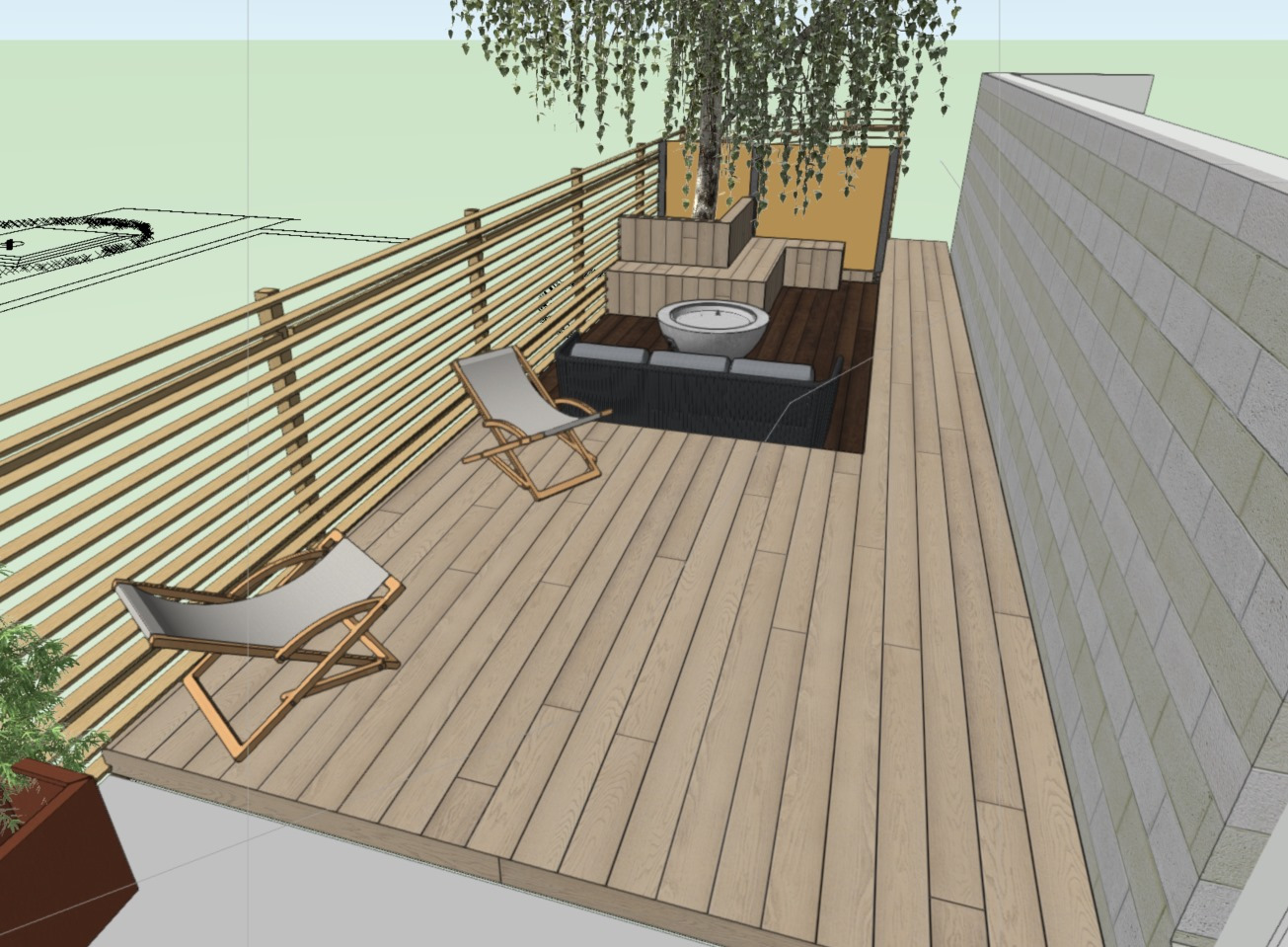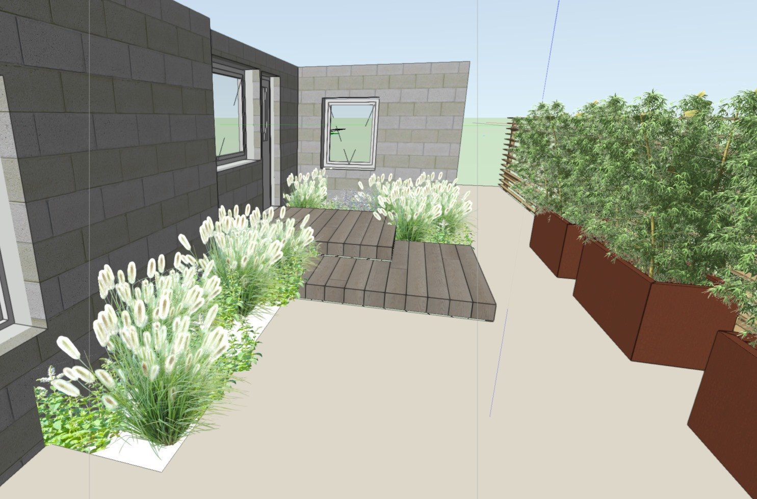 Design: Millboard platform steps from the back door onto a porcelain patio. Corten steel planters = screening with bamboo. Fence – Jacksons fencing venetian hit and miss panels. Step up to millboard deck – space for dinning table. Step into sunken deck with built in bench wrapping around silver birch tree. Corten steel panels screening utility space beyond.