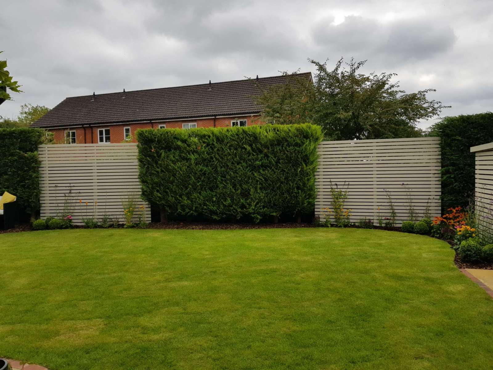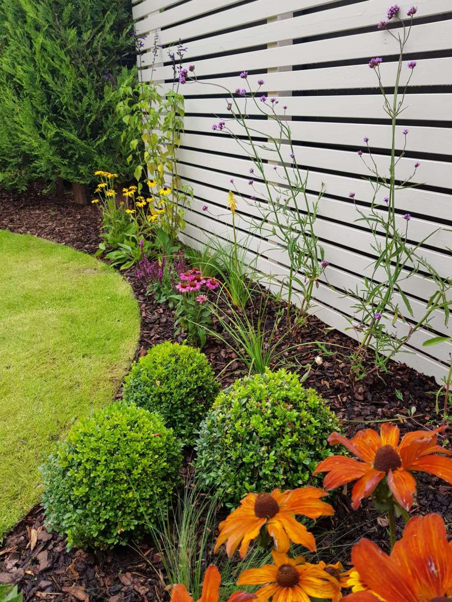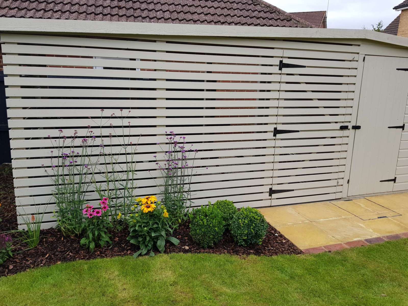 Design Back: Screening batten between hedge gaps with colourful perennial planting in front. Reshaped the boarders to add interest to the lawn. Designed a bespoke bike store and shed to provide ample storage for the family, whilst not intruding on the limited sized space.