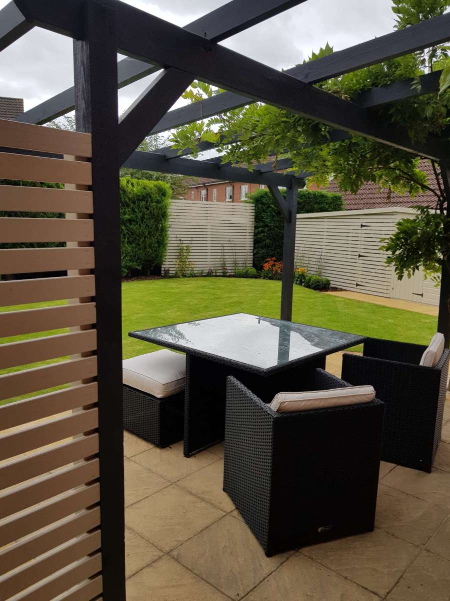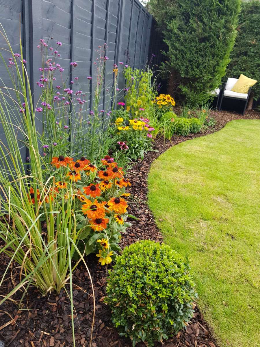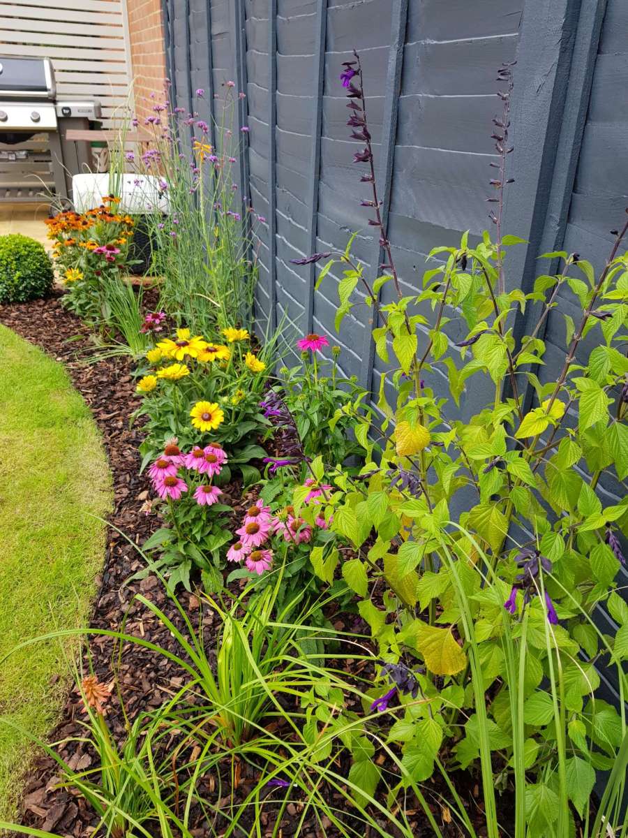Design Back: Screening batten between hedge gaps with colourful perennial planting in front. Reshaped the boarders to add interest to the lawn. Designed a bespoke bike store and shed to provide ample storage for the family, whilst not intruding on the limited sized space.