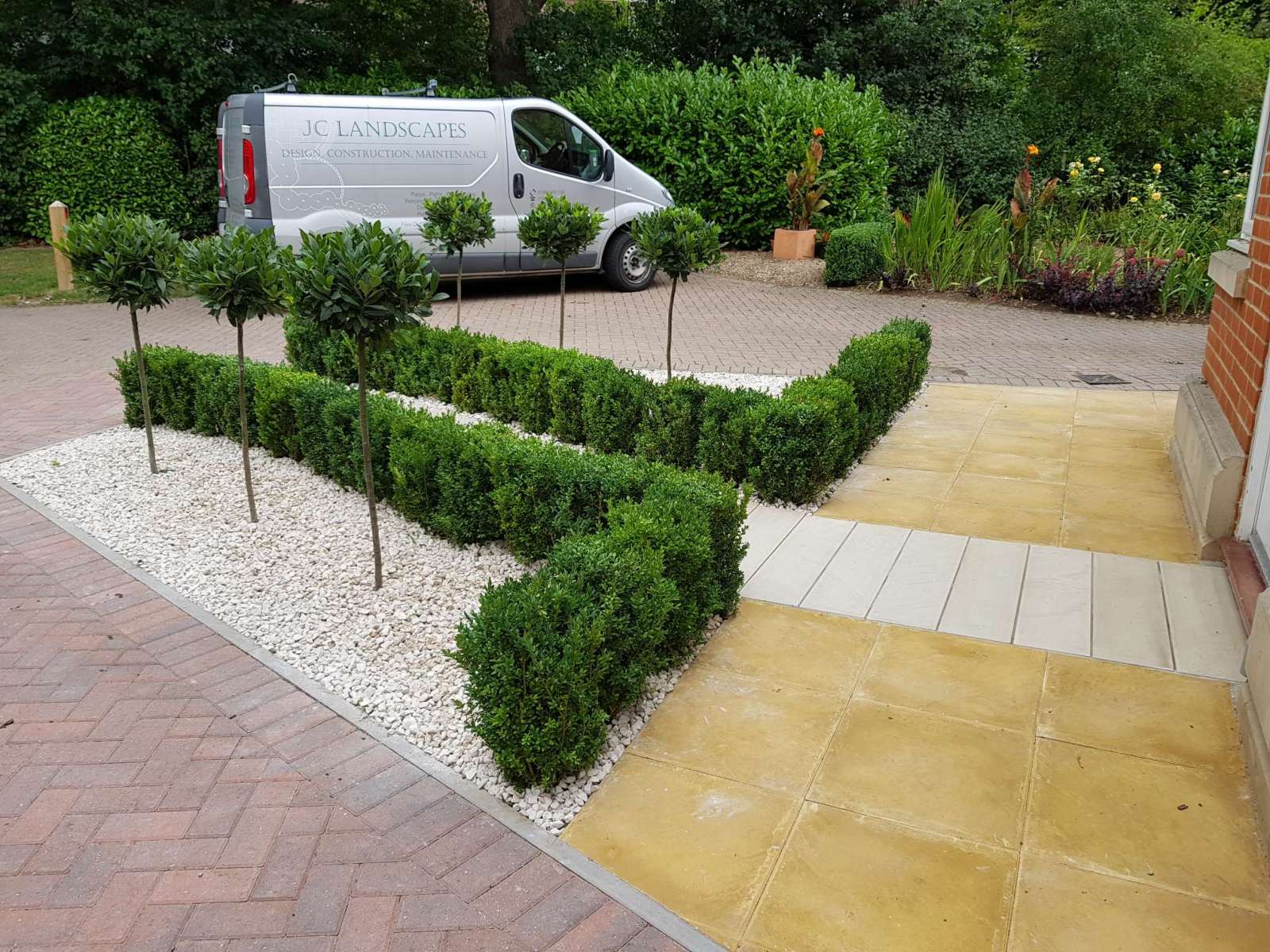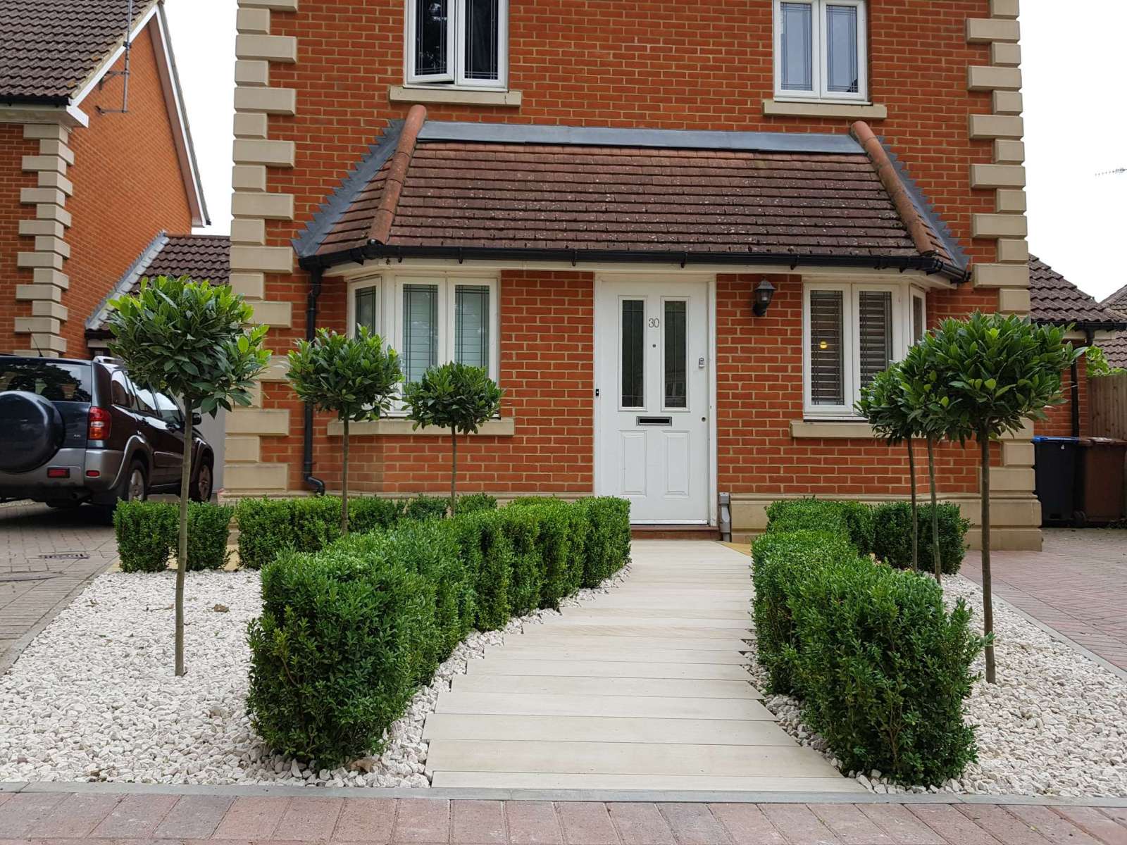 Design Front: Create a balanced and formal scheme for an awkward plot. Curved sandstone path up to front door – framed with low box hedging. Area covered in decorative aggregate and planted with bay standard trees. Area planted with colourful tulips to add a pop of colour in spring.
