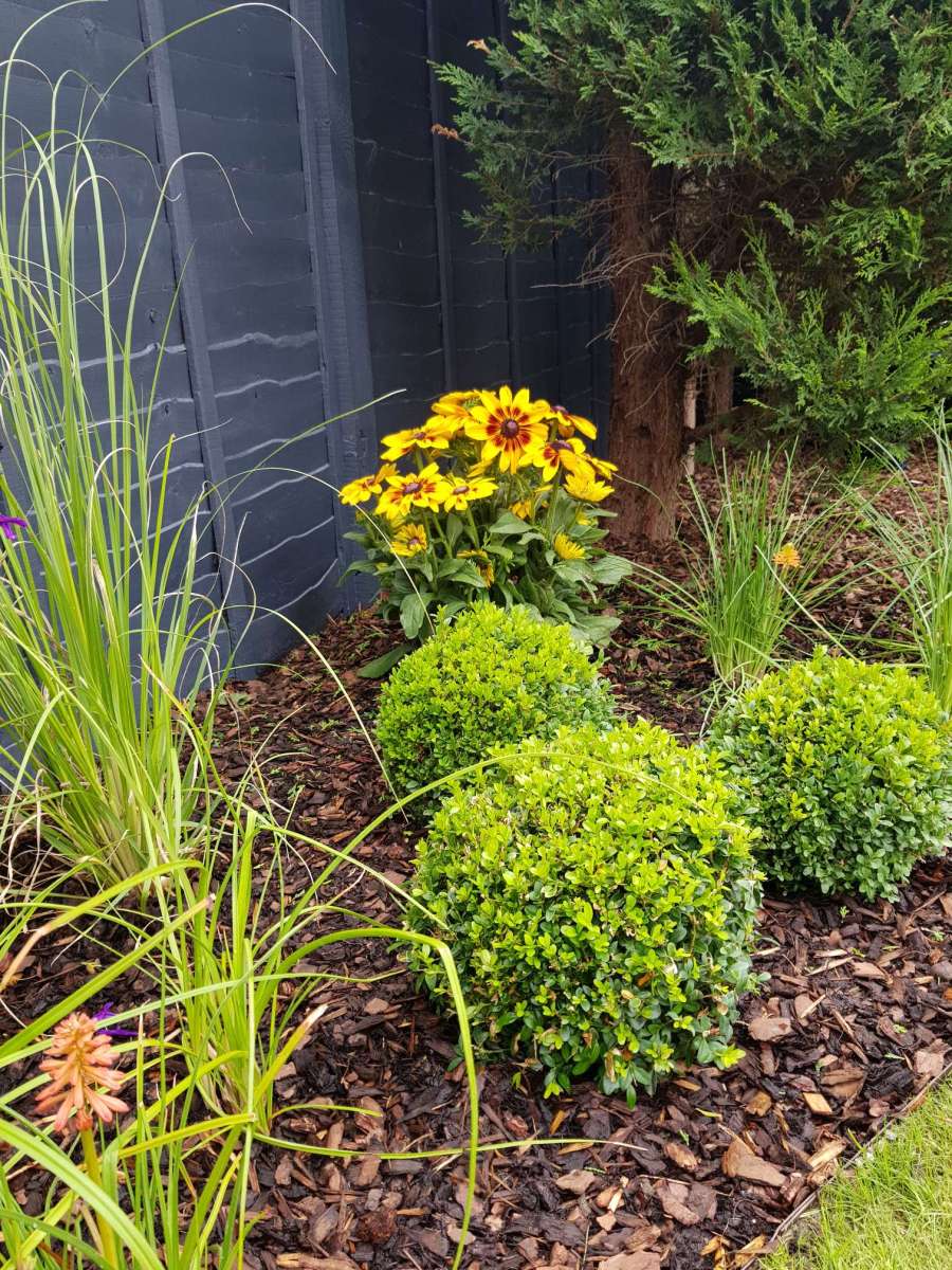 Brief: To create a low maintenance front garden in a formal style. To add colour to back garden, and create storage for bikes for family of 4. To come up with a solution to the gaps in the leylandii hedging.