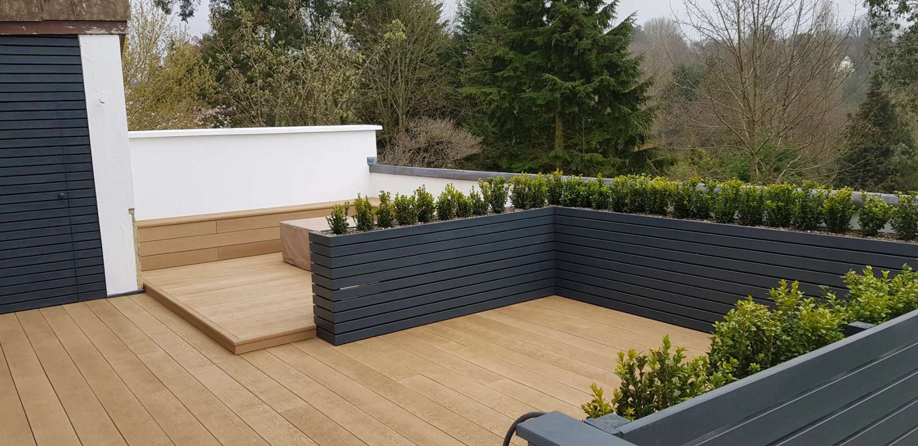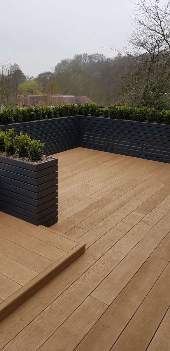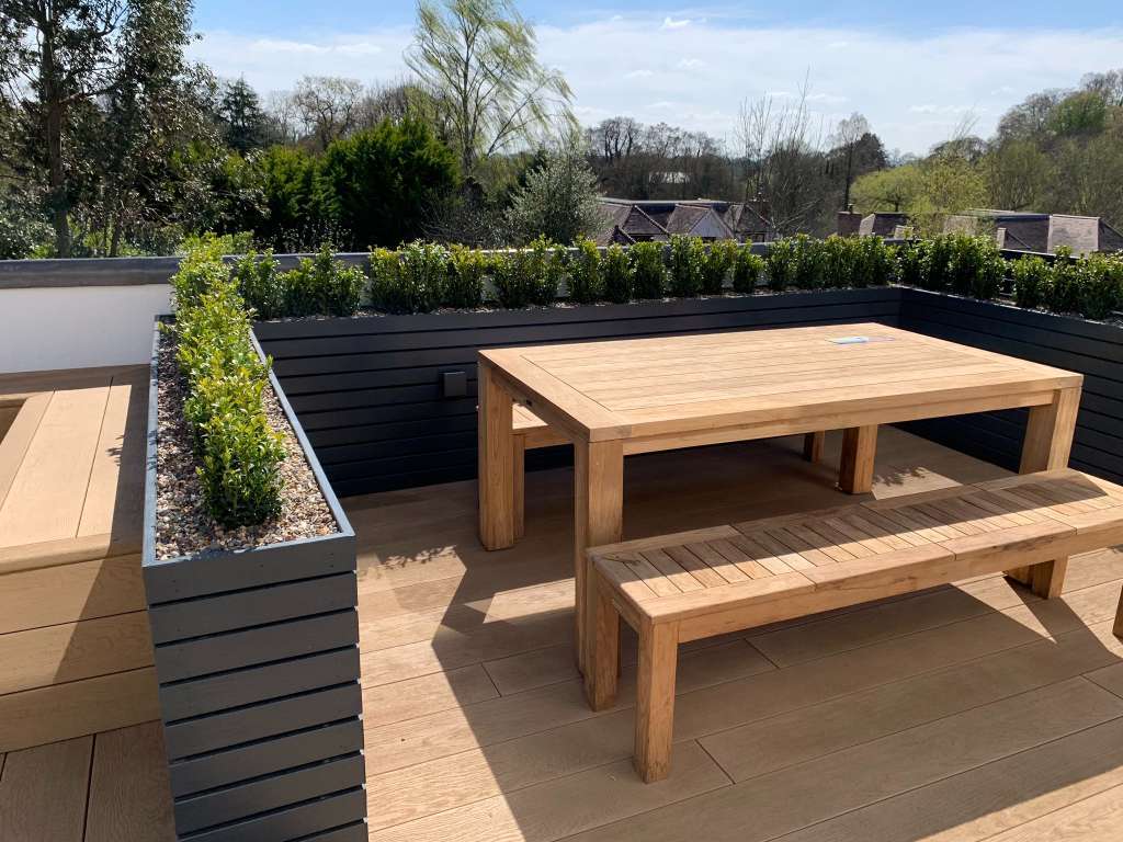 Design: Millboard deck balcony. Built in wrap around bench with gas fire pit. Dining space created with timber raised planters filled with low box hedge. Steps leading down onto patio – storage under deck frame. Limestone paved patio space, with an artificial grass section for kids to play. Open pergola frame around the edge of patio for climbers to grow up.
