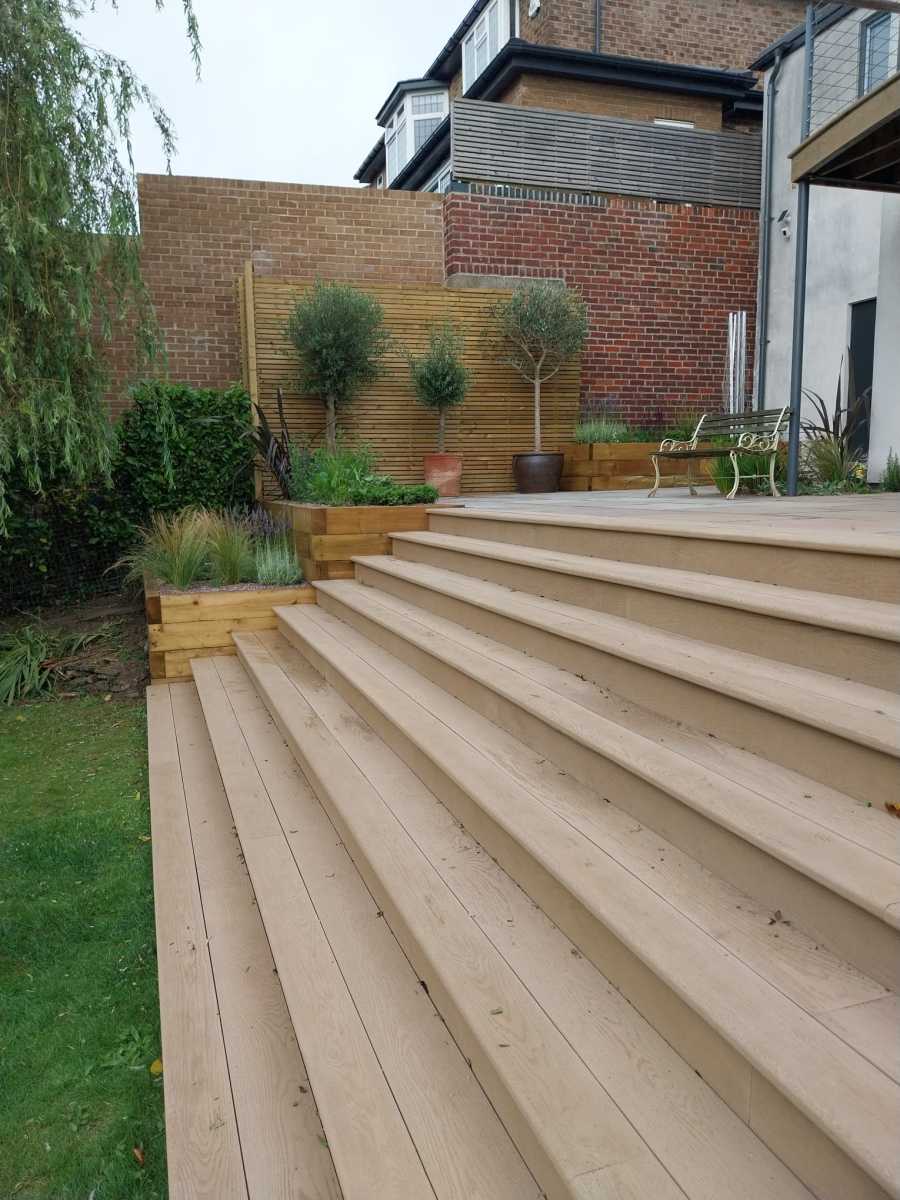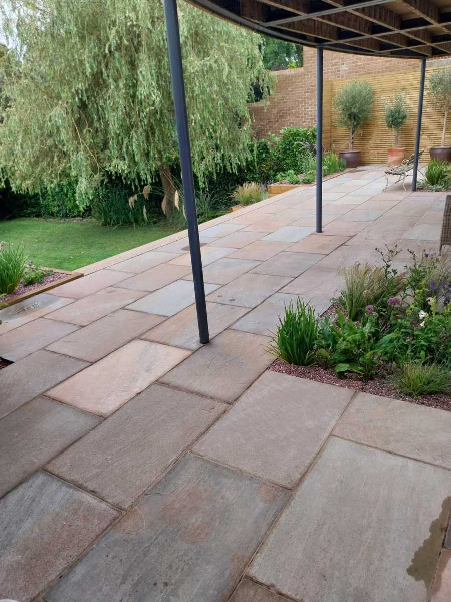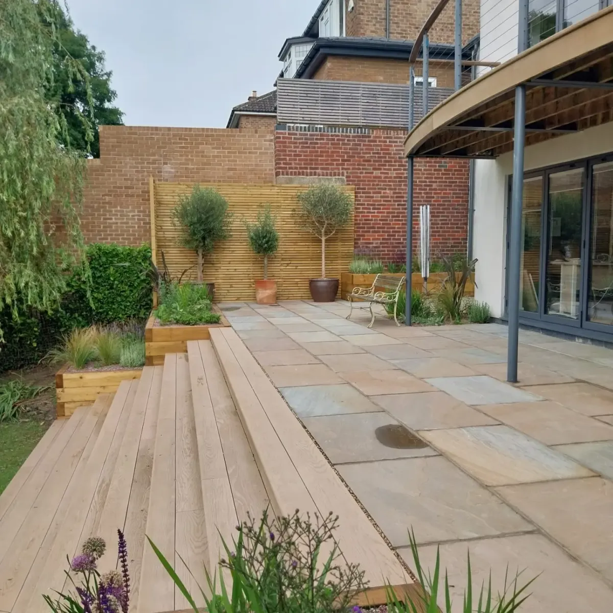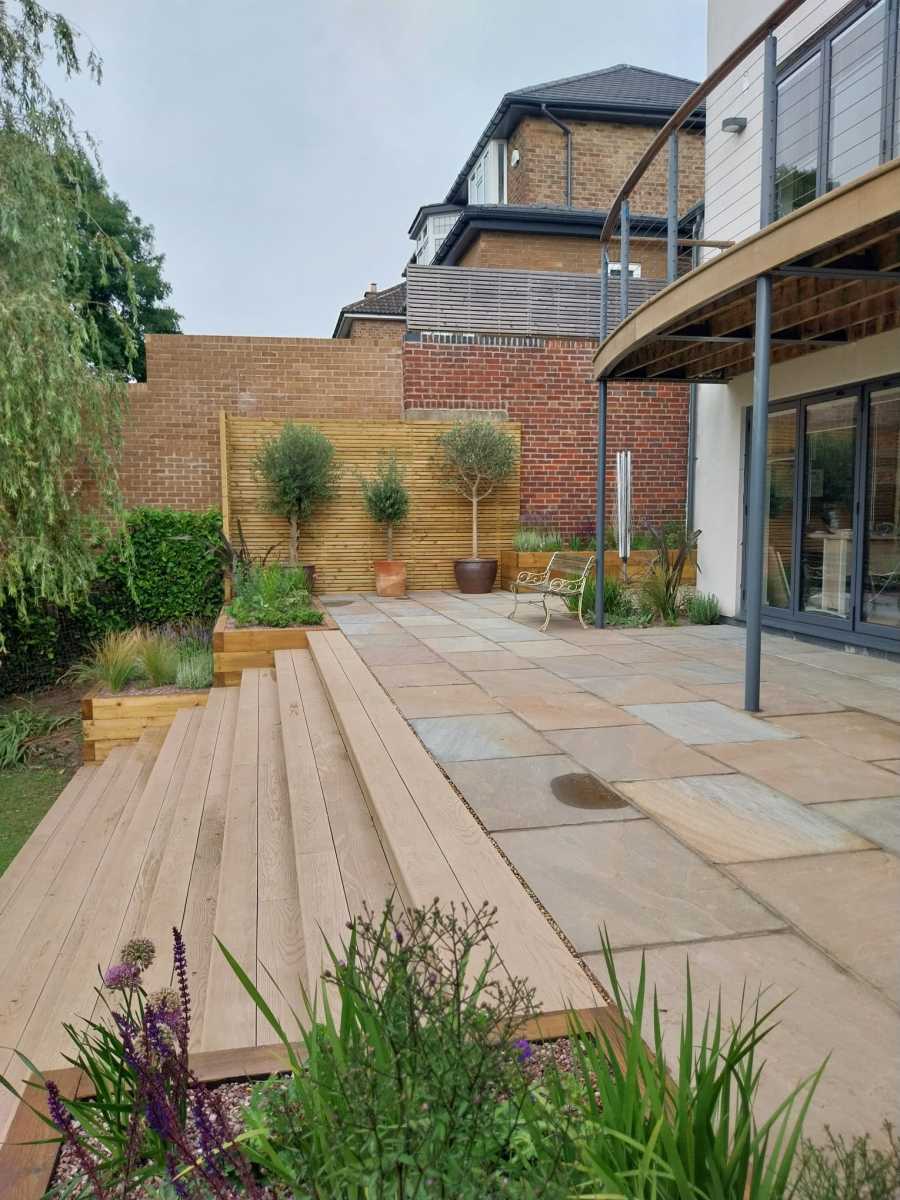 Design: A large sandstone patio using 900x600mm slabs. Breaks in the paving with planting pockets to soften the space. Railway sleeper beds to retain the patio and replace the rockery. 7.5m wide steps down through centre of the bank. Dramatic statement. Steps built from Millboard to match the clients existing balcony. Sleeper beds packed with colourful perennials, drought tolerant shrubs and ornamental grasses. All dressed with decorative aggregate to help with weed suppression and water retention.