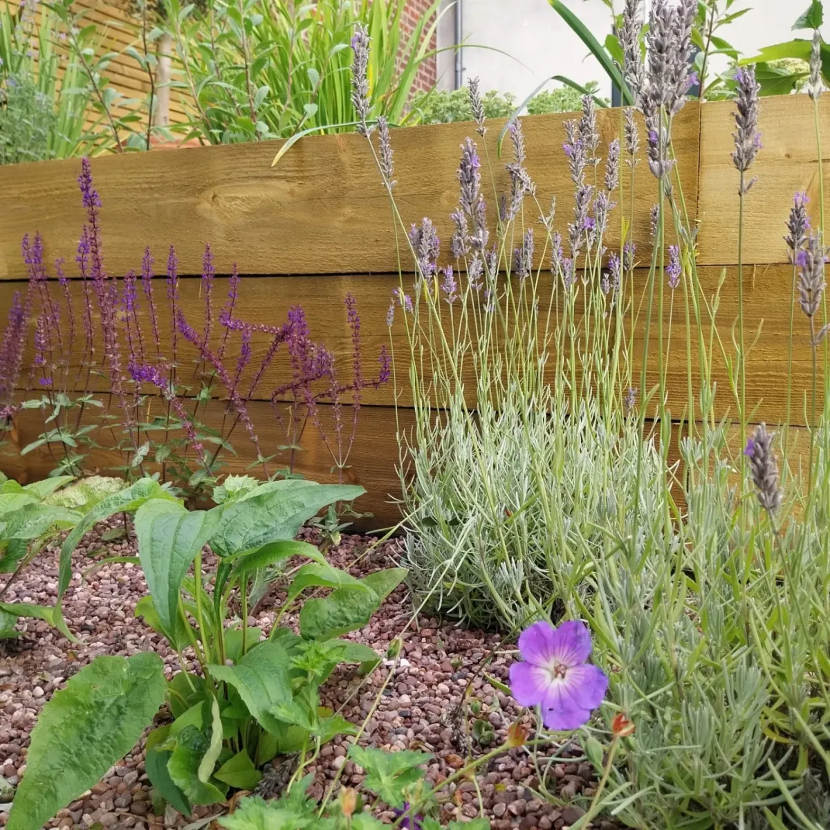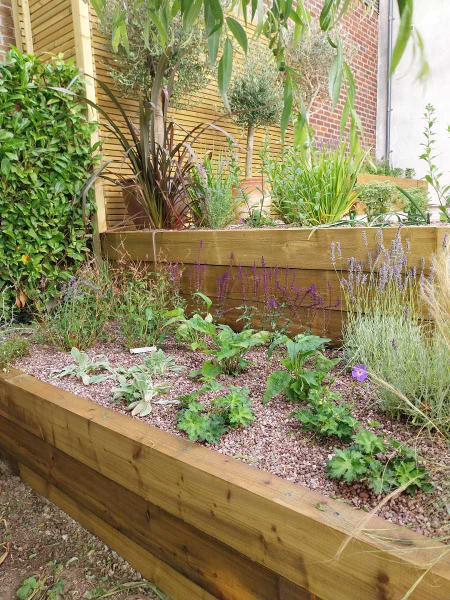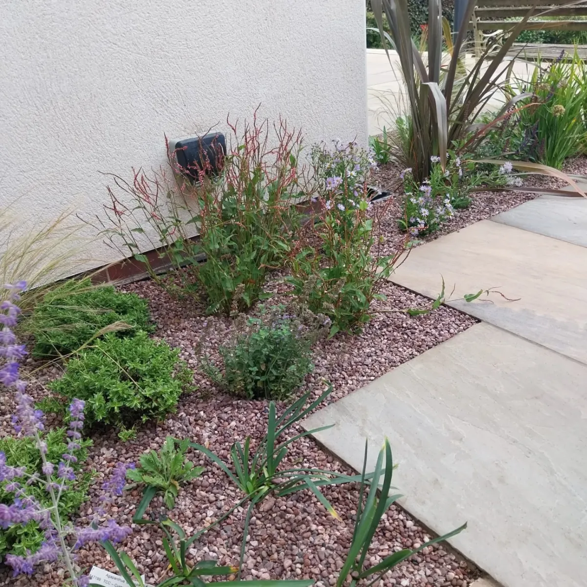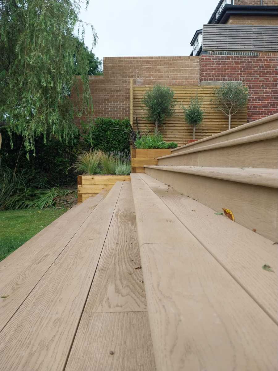 Design: A large sandstone patio using 900x600mm slabs. Breaks in the paving with planting pockets to soften the space. Railway sleeper beds to retain the patio and replace the rockery. 7.5m wide steps down through centre of the bank. Dramatic statement. Steps built from Millboard to match the clients existing balcony. Sleeper beds packed with colourful perennials, drought tolerant shrubs and ornamental grasses. All dressed with decorative aggregate to help with weed suppression and water retention.