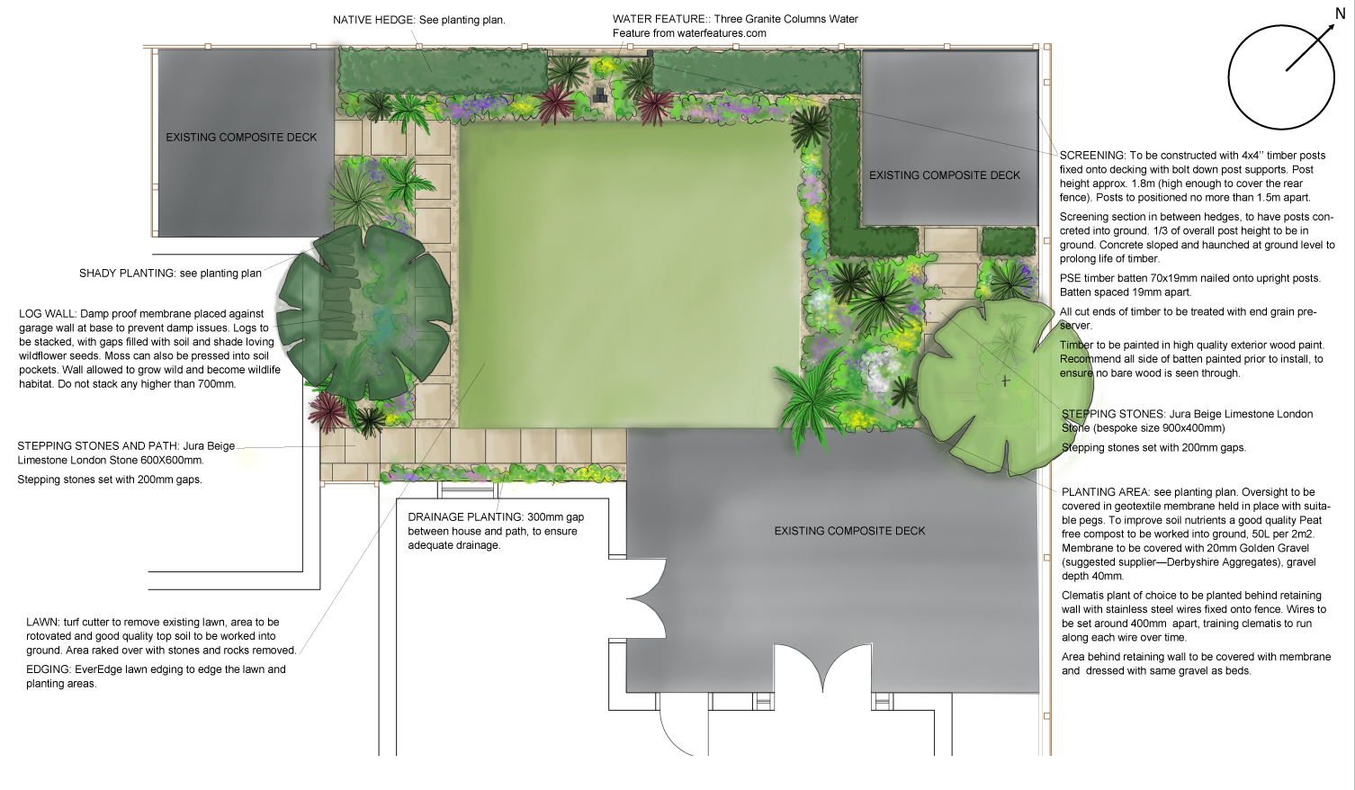 Design: Stepping stone path leading from bottom deck up to sun deck, surrounded by planting. A formal lawn with stepping stone path to a tucked away deck with aluminium screening and pergola to add privacy to hot tub.