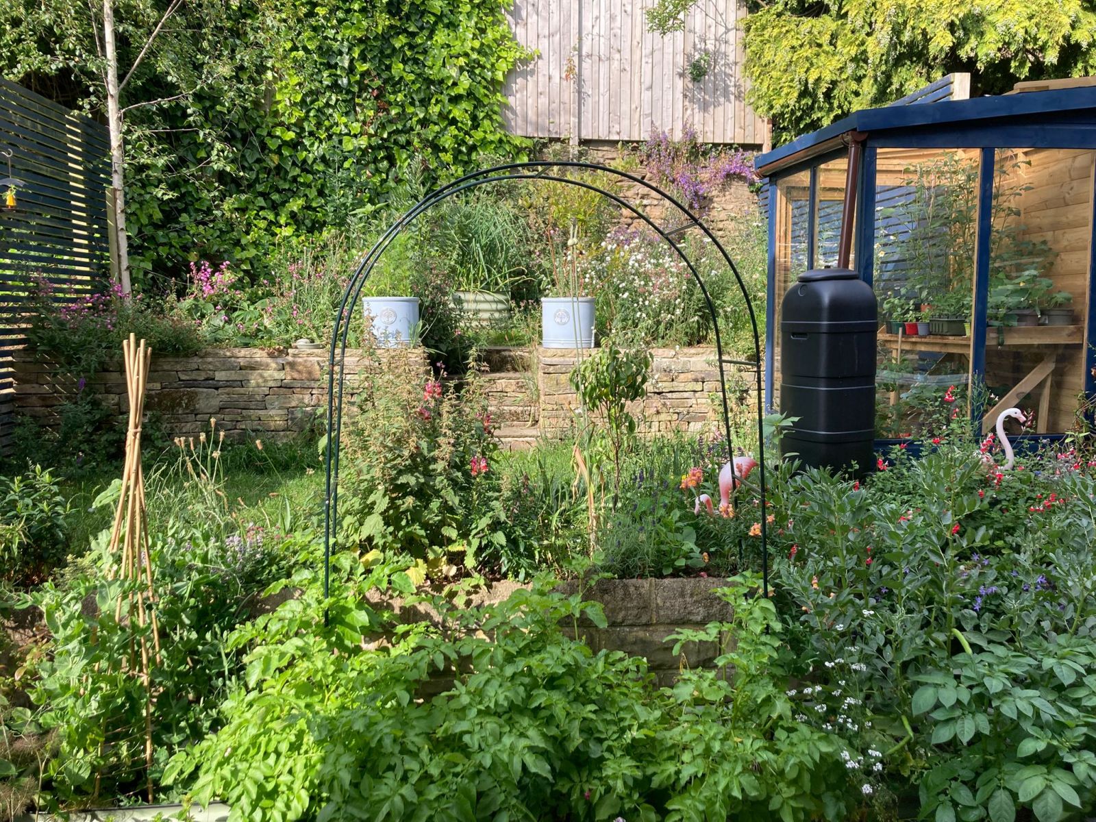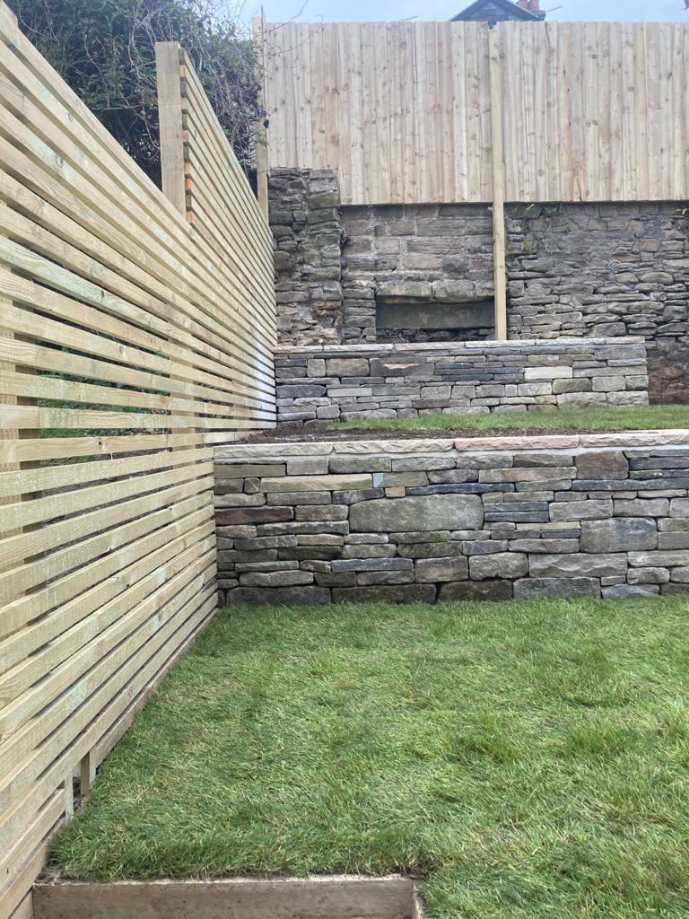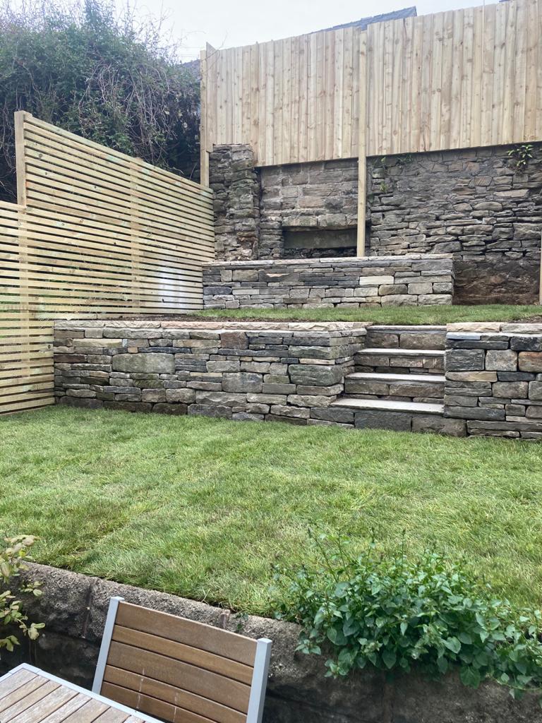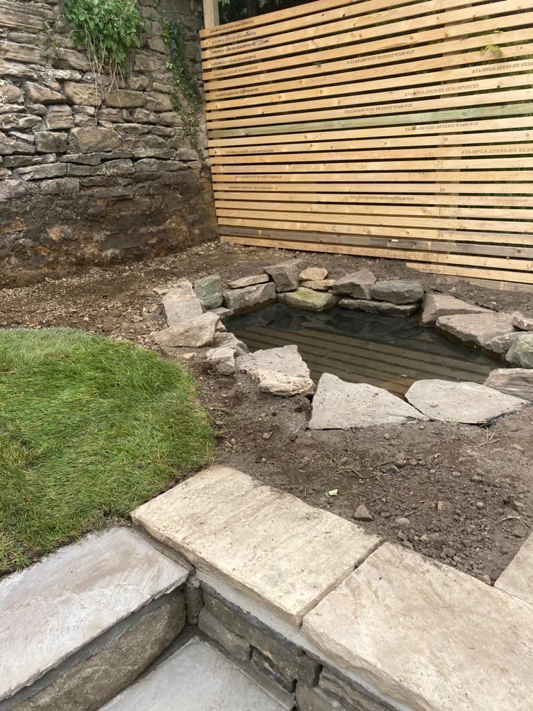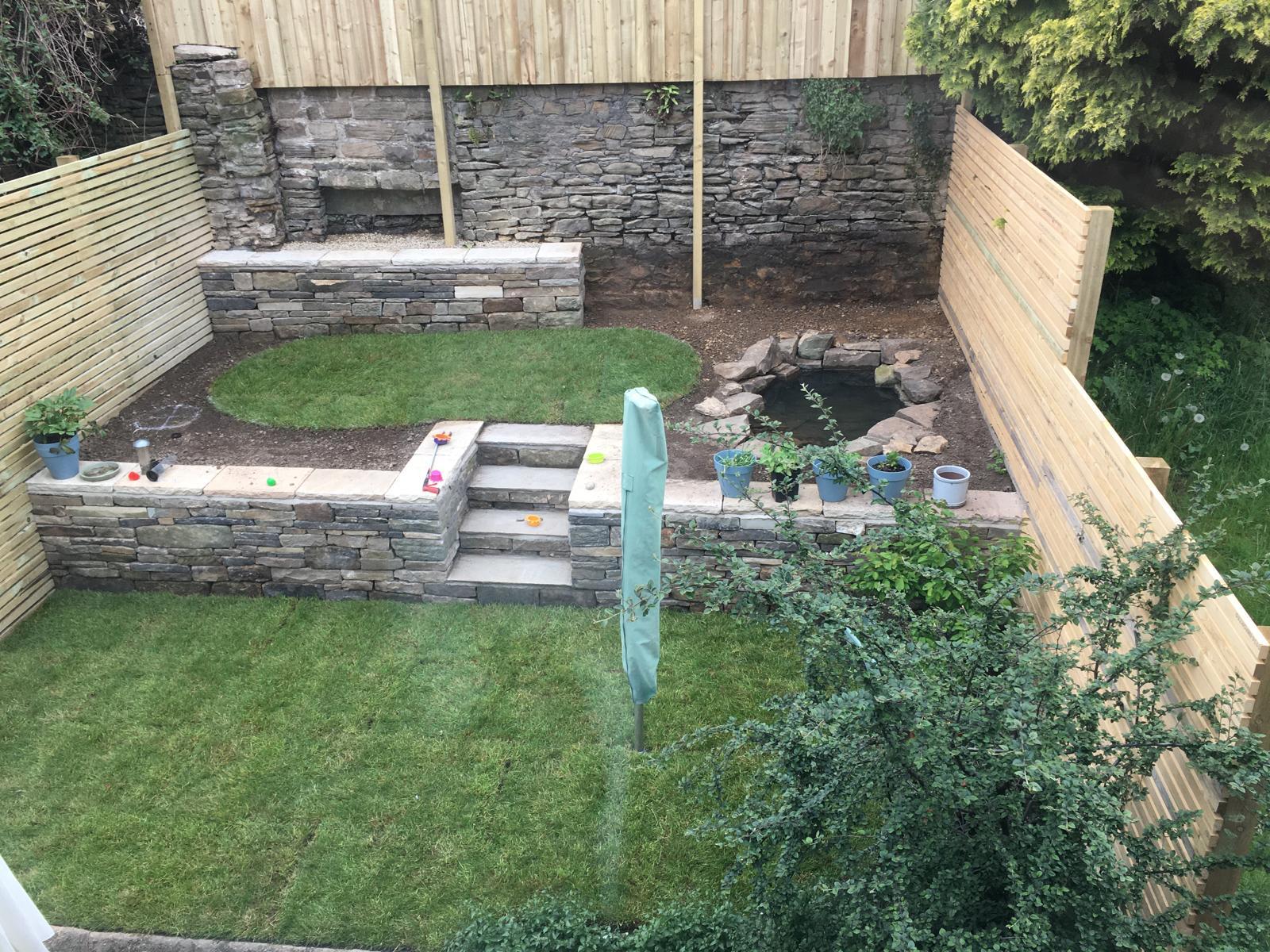 Design: Divided sloped lawn into two levels with a drystone retaining wall (perfect wildlife habitat for invertebrates and small mammals, as well as a sustainable choice with no cement required for foundations or mortar, and reclaimed stone sourced locally). Batten fencing on either side with hedgehog gaps. Small wildlife pond on top terrace, with wildflower around mowed lawn space. Lower terrace packed with wildlife friendly planting and another lawn for kids to play. The client has even found the space recently to add a greenhouse and water butt. Amazing what you can fit in a small city garden!